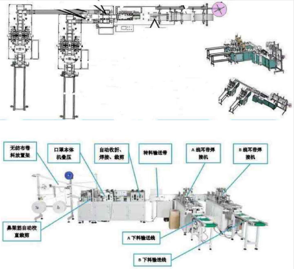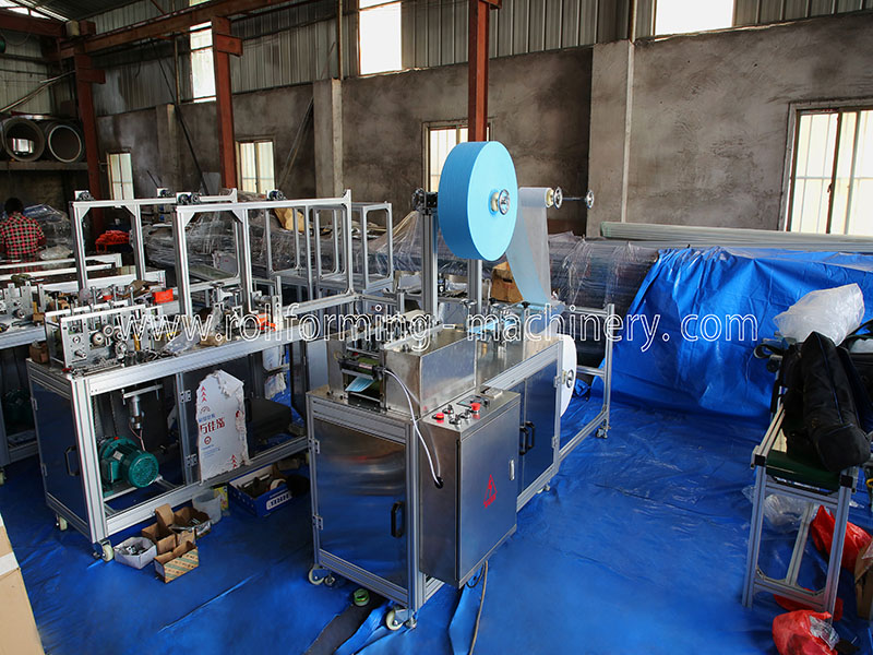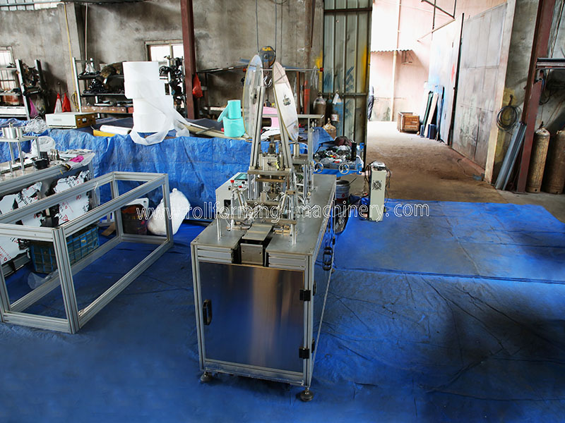 The mask machine is composed of a non-woven cloth mask body making machine and a mask inner ear belt machine. This machine is a fully automatic machine for the production of mask body. It adopts ultrasonic fusion technology to send in raw materials, insert, cut off, fold the scene, wrap and wrap the edge fusion, shape fusion, shape cutting to the output of finished products. The whole process is automatic and the output is high. In this machine, the elastic belt is fused on both sides of the mask body in ultrasonic mode to complete the finished ear belt mask. Only one operator is required to place one piece of the mask body on the conveyor belt fixture, and the rest of the subsequent actions to the completion of the finished product are automatically operated by the machine.